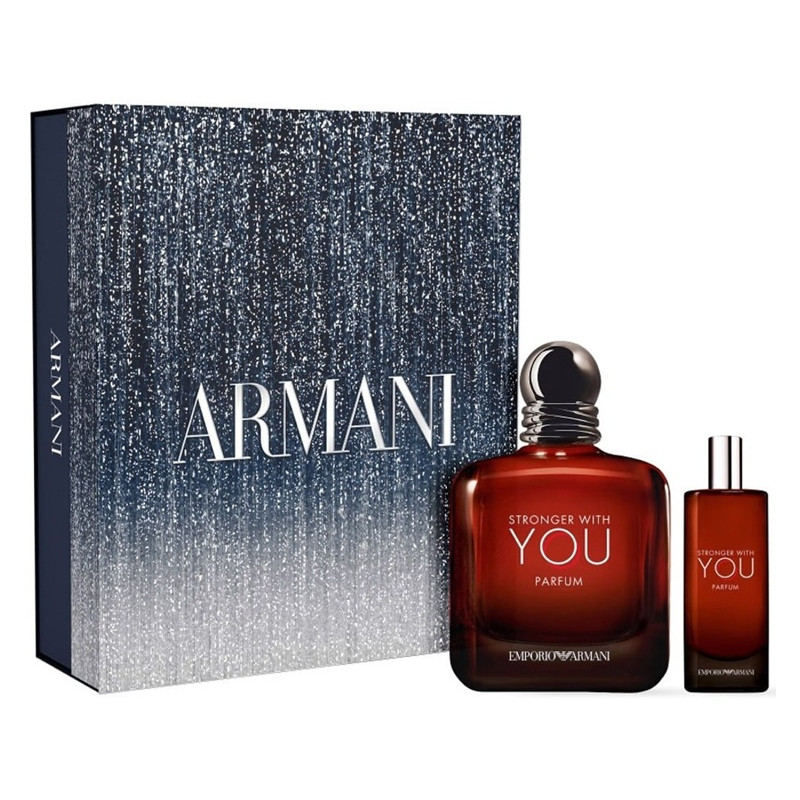 Stronger with You Parfum est présenté dans le flacon emblématique Stronger with You, au design épuré très masculin et aux tonalités ambrées. Il est orné d'un capot métallique, dont les anneaux entrelacés, signature de la collection Stronger with You, représentent la force de l'union